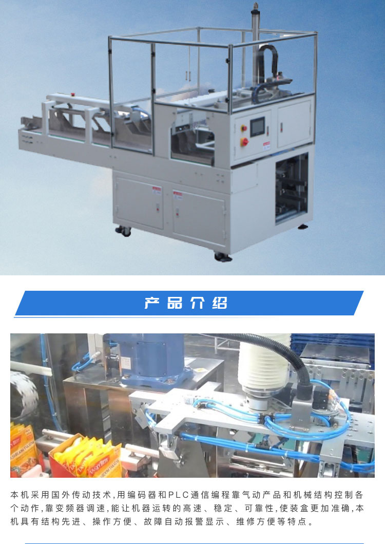介紹:本機采用國外傳動技術,用編碼器和PLC通信編程靠氣動產品和機械結構控制各 個動作,靠變頻器調速,能讓機器運轉的高速、穩定、可靠。本設備可實現自動下料,開盒,關盒,黏膠等。 解決您的三大包裝難題實現自動化生產:1、大大降低企業的生產成本,單臺裝盒機八小時生產力約為3-5萬盒,按此計算每臺裝盒機可省人工為10-15人;2、人工裝盒,易污染、易出差錯.車間多一人,更是多一個污染源.人工裝盒有時會漏裝說明書或內容物;3、提高企業生產力,從企業管理角度上來講,管理人難,管理設備易。 產品別稱:裝箱機、裝盒機、自動裝箱機、自動裝盒機、跌落式裝箱機、側推式裝箱機、抓舉式裝箱機、機器人裝箱機、一片式裹包機、條形全自動裝盒機。